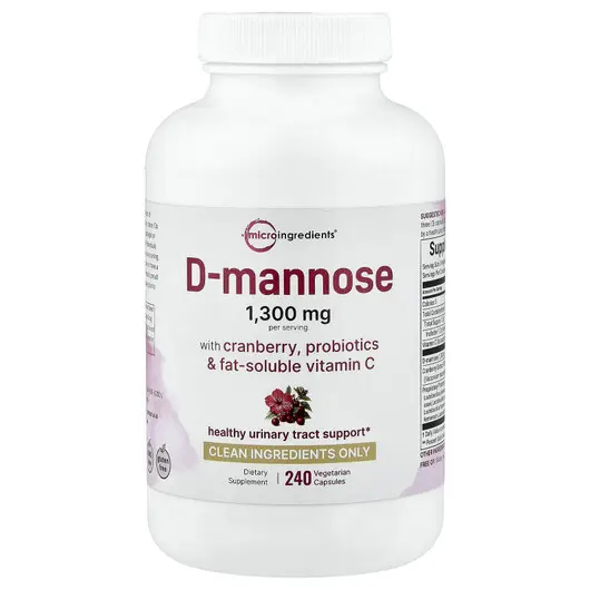 Micro Ingredients пропонує комплекс капсул з чистим D-Манозом, створений за допомогою чистих інгредієнтів без наповнювачів. Насолоджуйтеся порцією з підвищеною потужністю 1,300 мг, яка містить журавлину, легко засвоюваний жиророзчинний вітамін C та змішану культуру пробіотиків на 1 мільйон CFU для підтримки здорового сечового тракту.